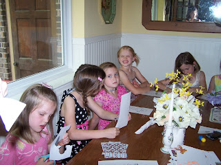I ignored the old proverb about April showers, and IT RAINED! Well, not RAINED, but rained........just enough to get everything wet. So we moved the garden tea party inside. It was not what I had planned, but it was what God had planned. All in all, the granddaughters said it was the best one ever. I'd love to think that I'm just getting better and better at hosting tea parties, but I think that the friends who were invited to the special "friends day" helped. We talked about manners, and all but the 3 year old did a pretty good job. She'll learn. And we talked about friendships and how important it is to be a true friend. Here's the result of our friends tea party: